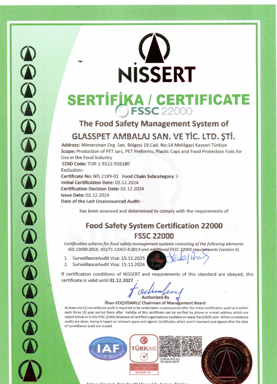 Üretim süreçlerimiz uluslararası gıda güvenliği ve kalite yönetim sistemleri tarafından denetlenmekte ve onaylanmaktadır.